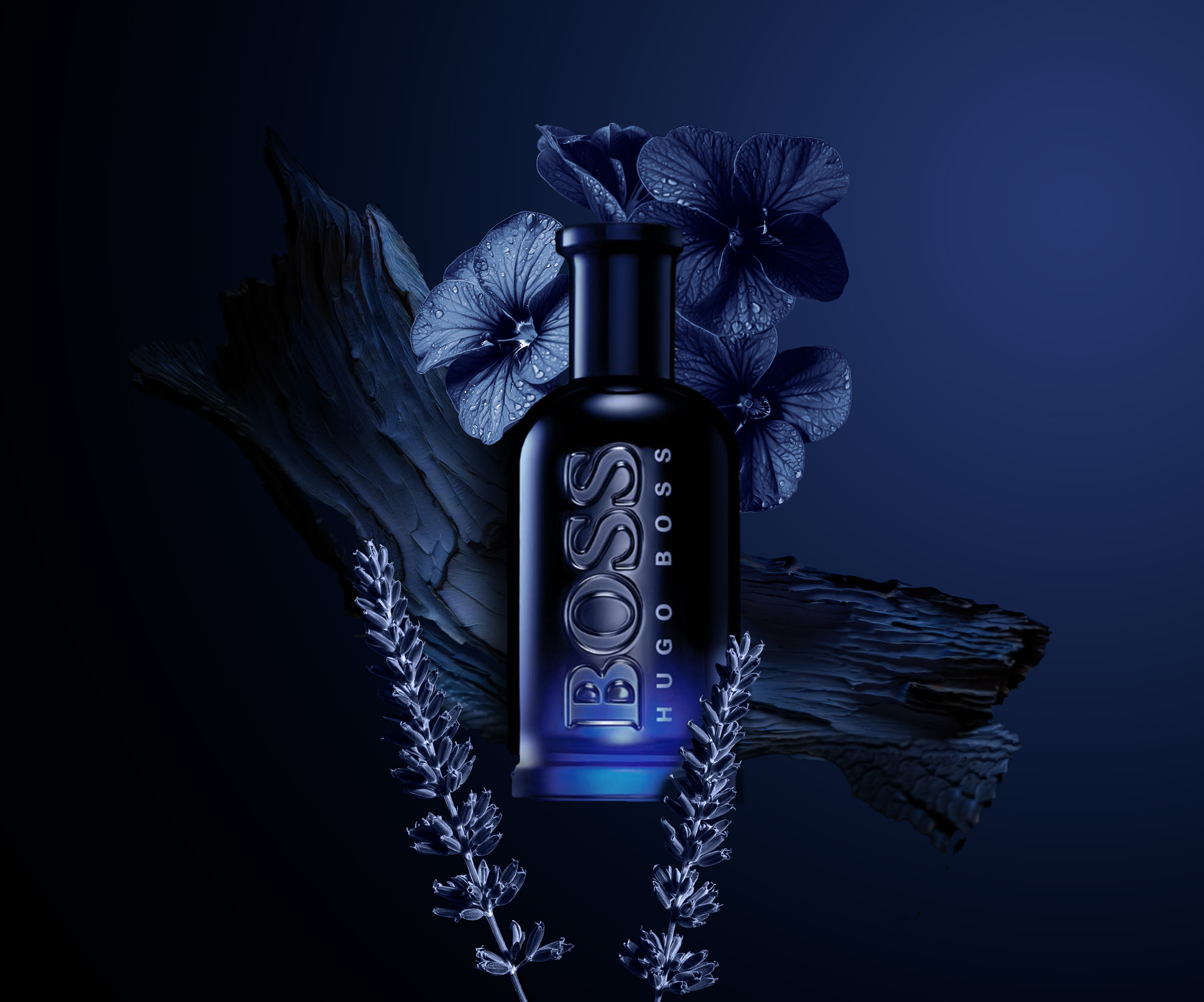 Hugo Boss Key Visual for Hugo Boss Bottled Night Fragrance using AI generated AssetsComissionned by The Content Hub – Coty